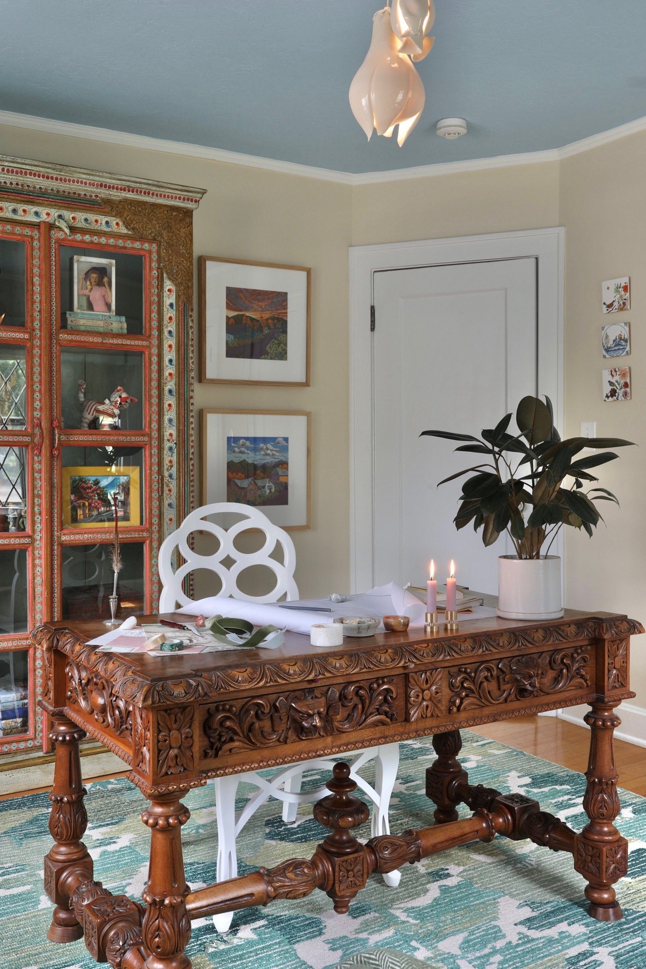 Inside, rich colors and layered textures bring the home to life. Deep navy walls, sculptural lighting, carved wood, and playful patterns create spaces that feel both curated and lived-in. Materials are left raw where it counts, offering a tactile connection to the home’s craftsmanship and age.